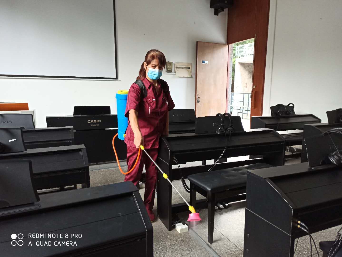 同时,还安排人员对艺术楼和体育场馆中心的各个教学场所进行了卫生清扫和消毒处理,确保师生在卫生、安全的环境中工作、学习。